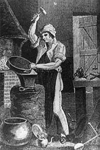 Even before the American Revolution, British and Irish settlers in the northeastern states had established a tradition of travelling tinsmiths — the original Yankee peddlers. They brought their household tinwares to the sparsely settled countryside, often doing custom work to fit farm or household needs. Coppersmith shops became common after the advent of copper mining in the middle of the 18th century. The coppersmiths produced both heavy and light domestic wares, but also produced much fine work. Paul Revere was originally a coppersmith.